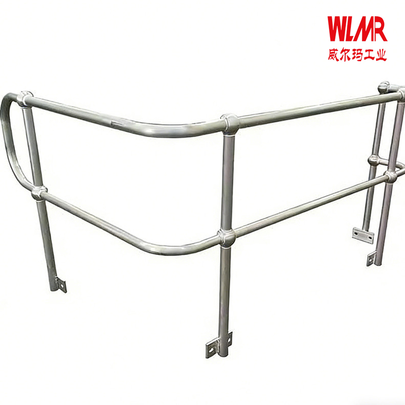 Structurellement, le garde-corps est constitué de tuyaux en acier inoxydable de faible épaisseur (formés en segments courbes ou droits) et de joints à rotule sphériques (pour les connexions imbriquées, visibles sur l'image). Il présente une finition en acier inoxydable lisse et polie qui résiste aux taches et ajoute un éclat moderne. Les joints à rotule sont conçus avec précision pour verrouiller les segments en toute sécurité tout en permettant des ajustements à 360 degrés, garantissant ainsi un ajustement serré pour les configurations personnalisées. Les supports de montage (fixés aux bases des poteaux) permettent un ancrage sécurisé aux sols ou aux murs, et les segments de rail incurvés (comme illustré) améliorent la prise ergonomique pour les utilisateurs. Tous les composants sont non toxiques et sans danger pour les aliments, ce qui les rend adaptés aux zones axées sur l'hygiène.